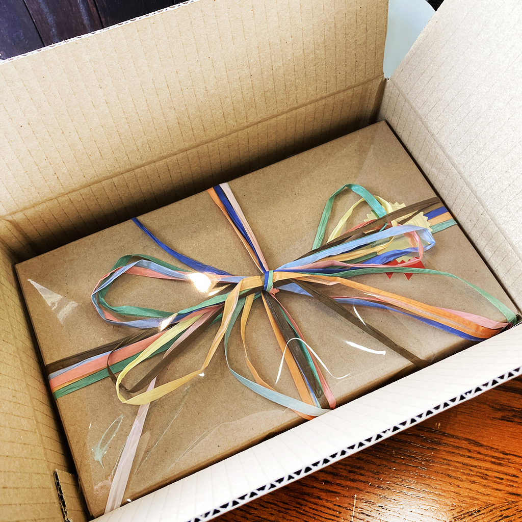 ガラス食器を守るために写真のようなクラフトボックス入り(箱入り)のラッピング方法になります。